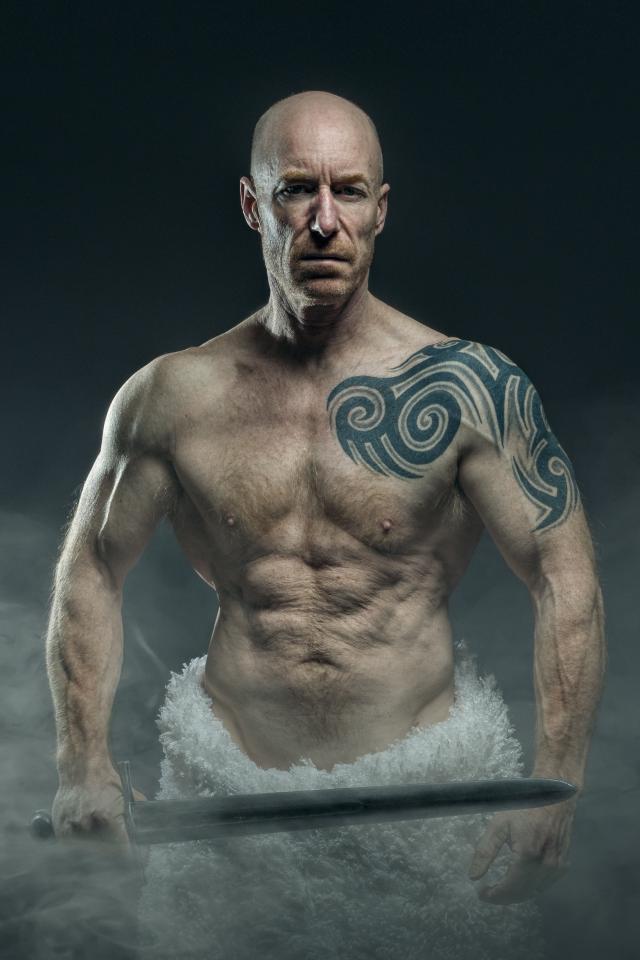 Обои Сильный мужчина с мечом с татуировками на теле