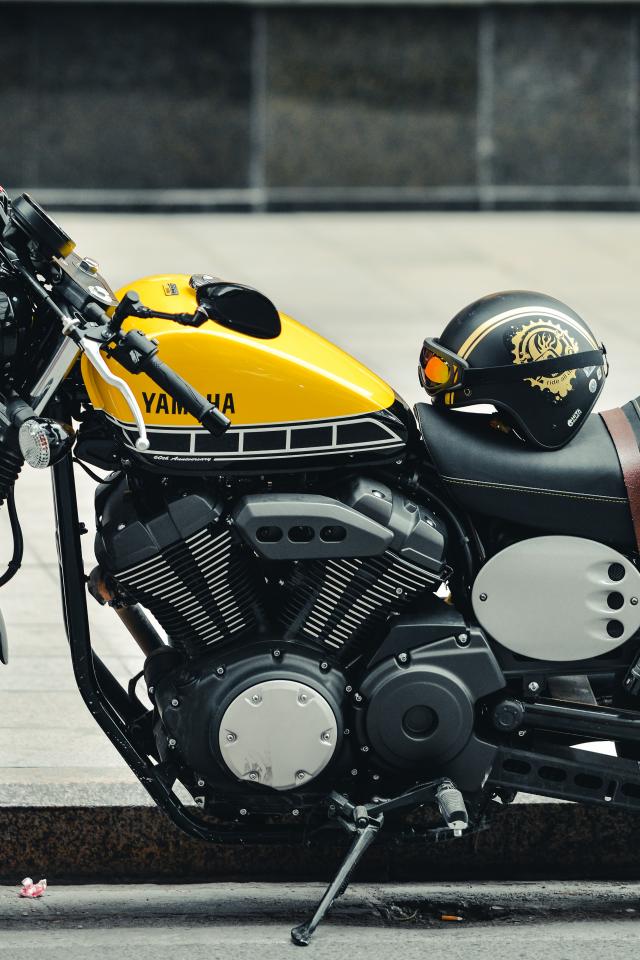 Обои Мотоцикл Yamaha со шлемом на сиденье