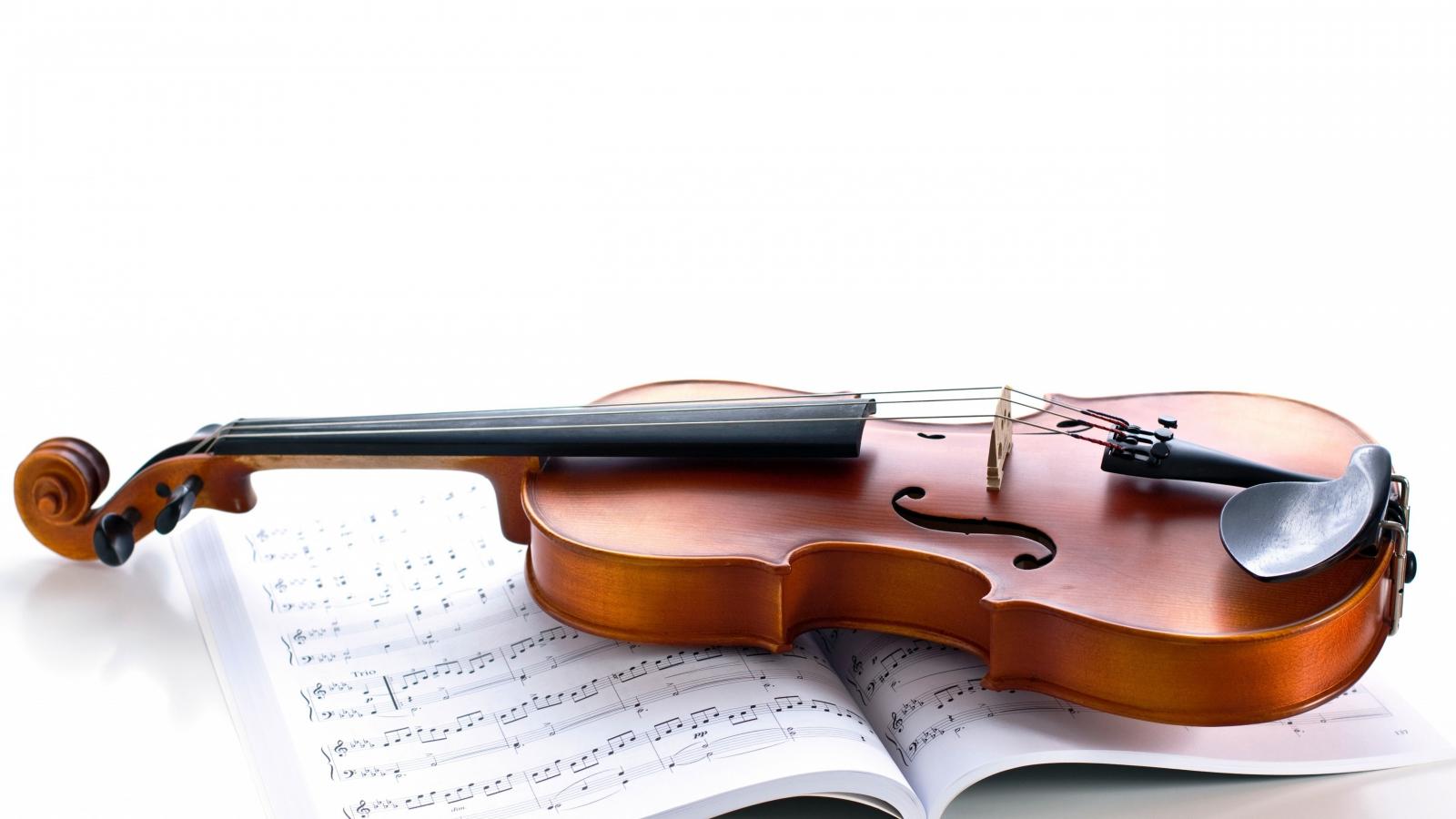 Обои Скрипка лежит на нотах на белом фоне