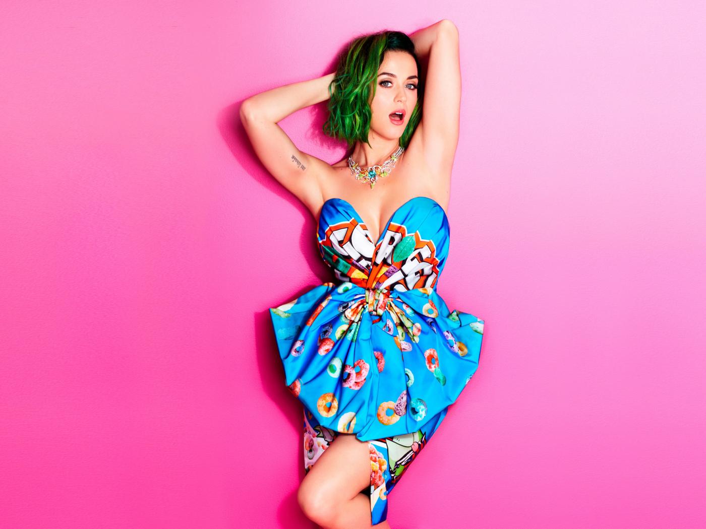 Обои Эпатажная певица Кэти Перри на розовом фоне