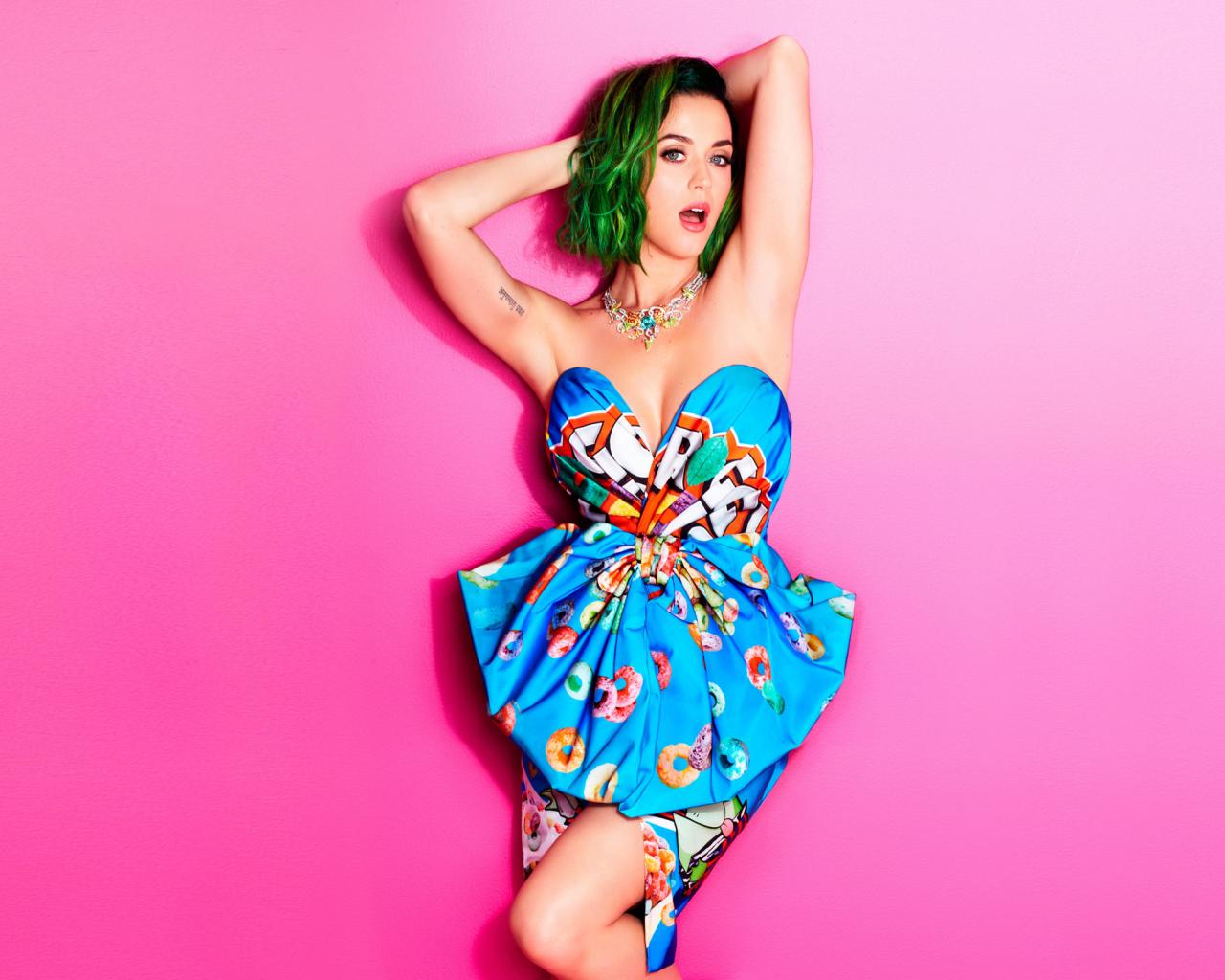 Обои Эпатажная певица Кэти Перри на розовом фоне