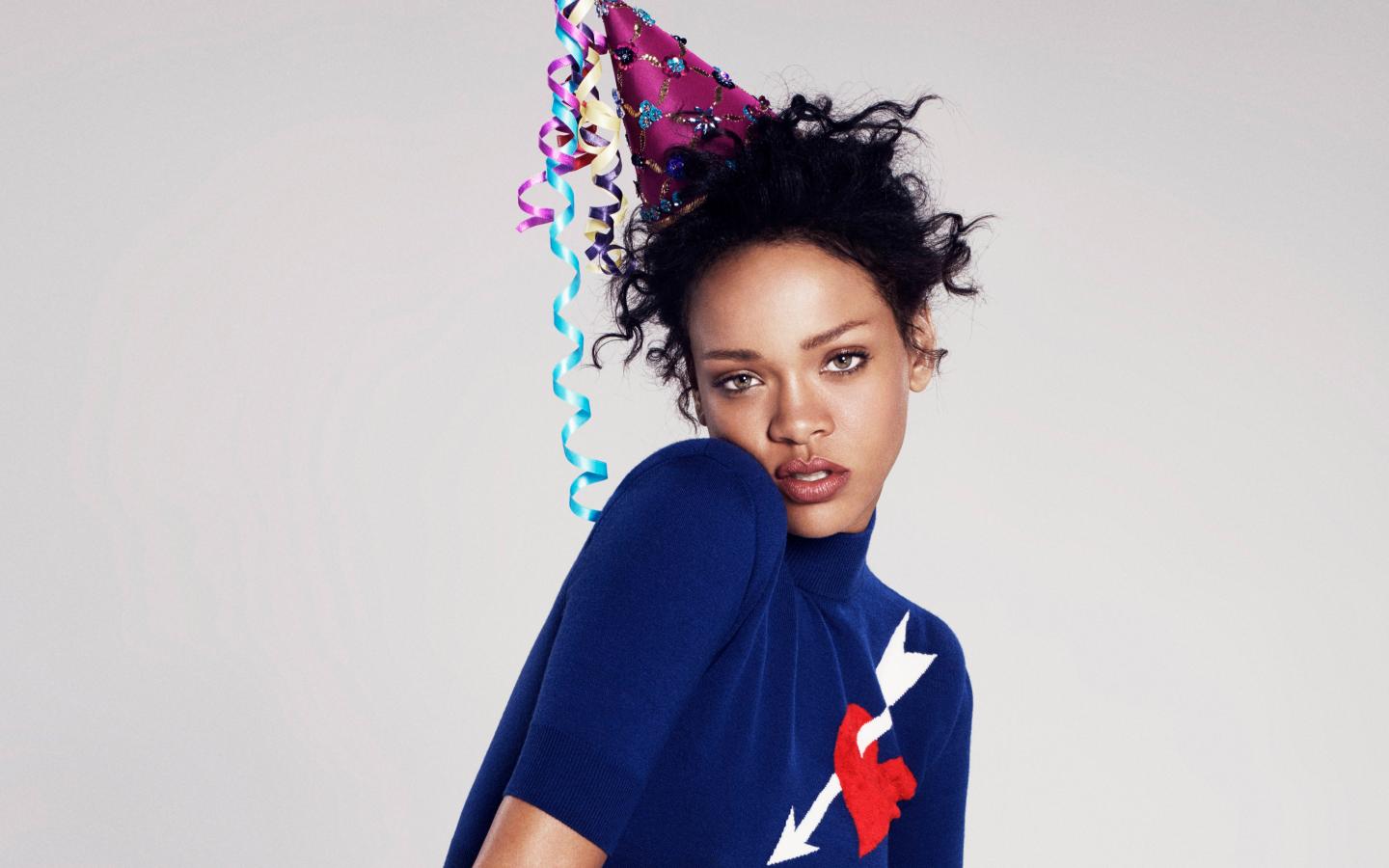 Обои Певица Рианна в праздничном колпаке на сером фоне