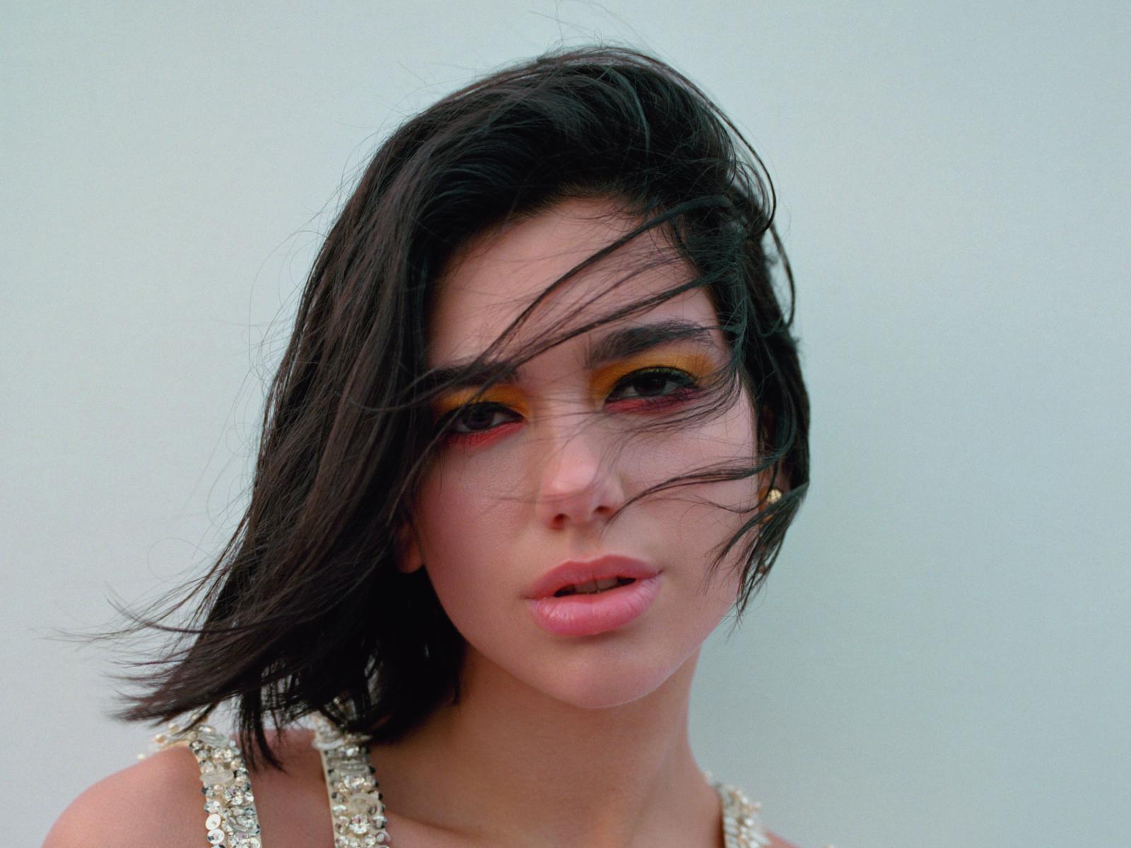 Обои Британская певица Дуа Липа с волосами на лице
