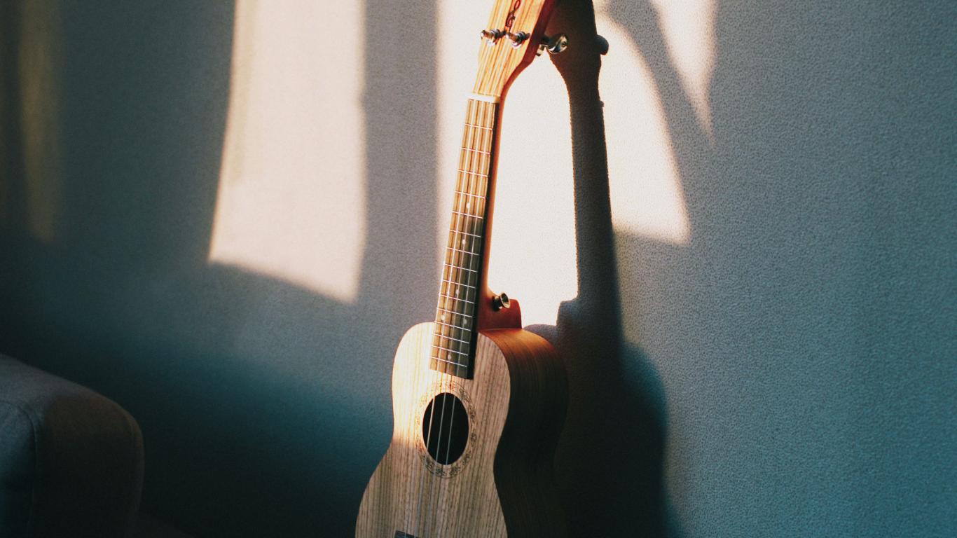 Обои Красная гитара стоит у дерева на опавшей листве осенью