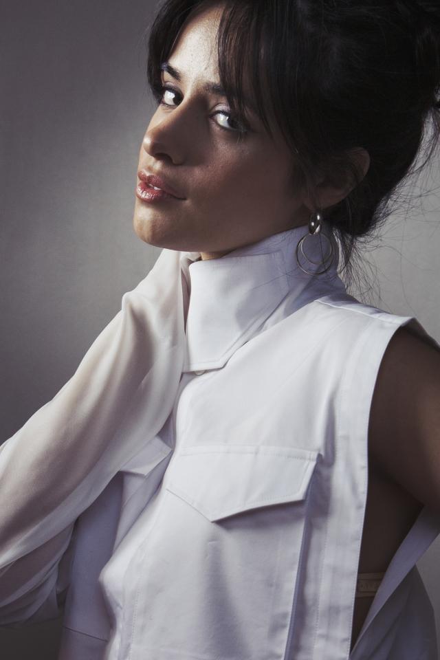 Обои Молодая певица Камила Кабельо в белом костюме у стены