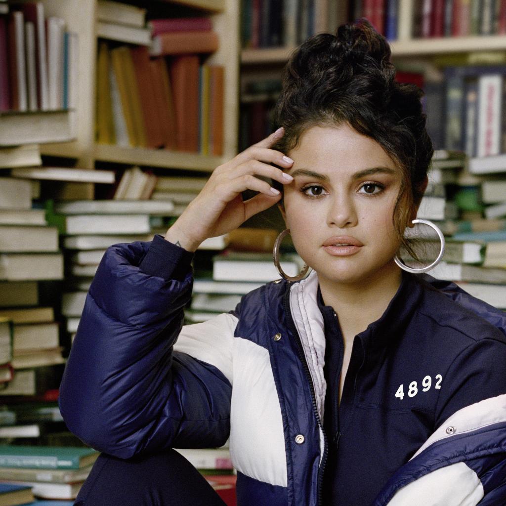 Обои Актриса и певица Селена Гомес в куртке сидит в библиотеке