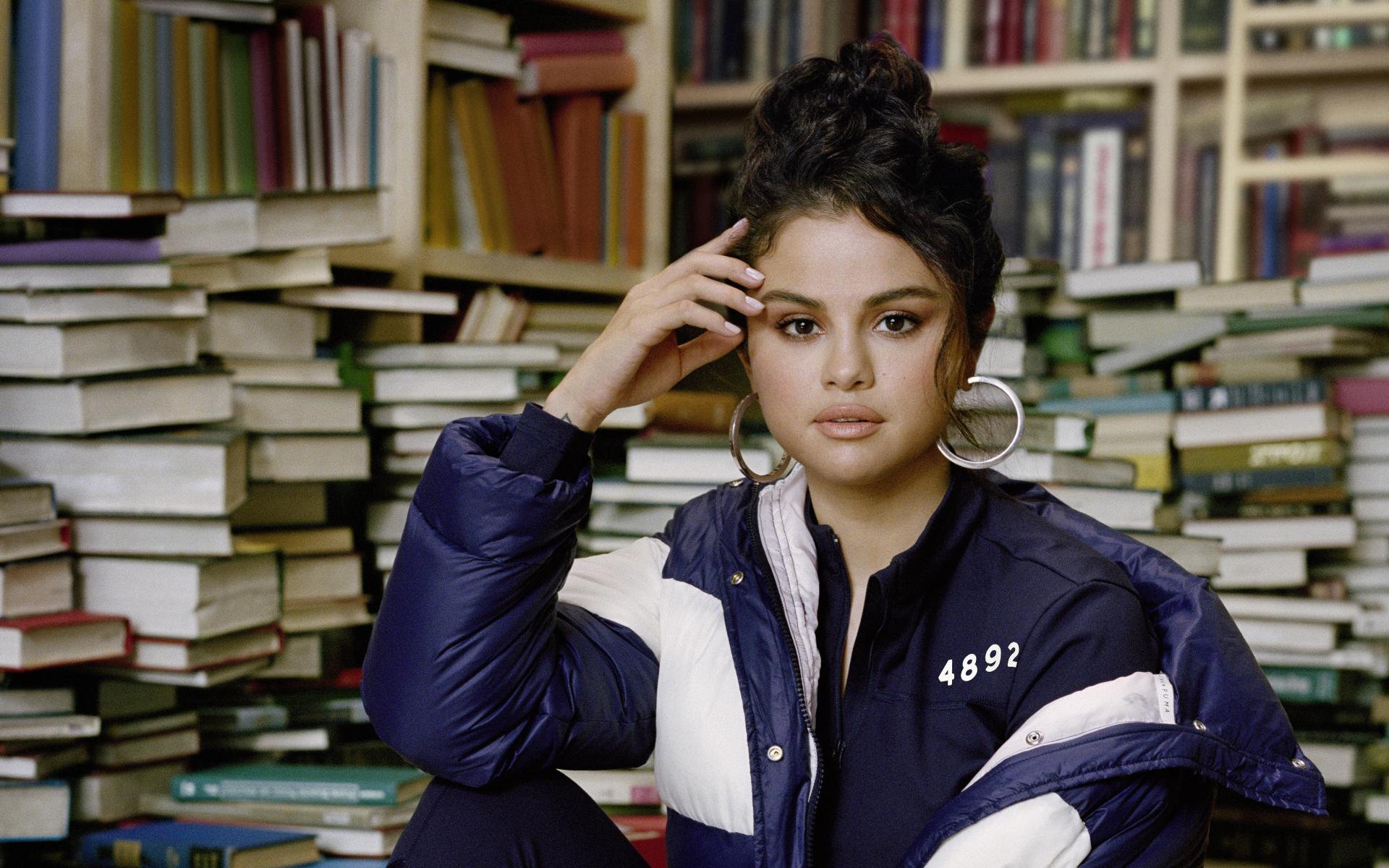 Обои Актриса и певица Селена Гомес в куртке сидит в библиотеке