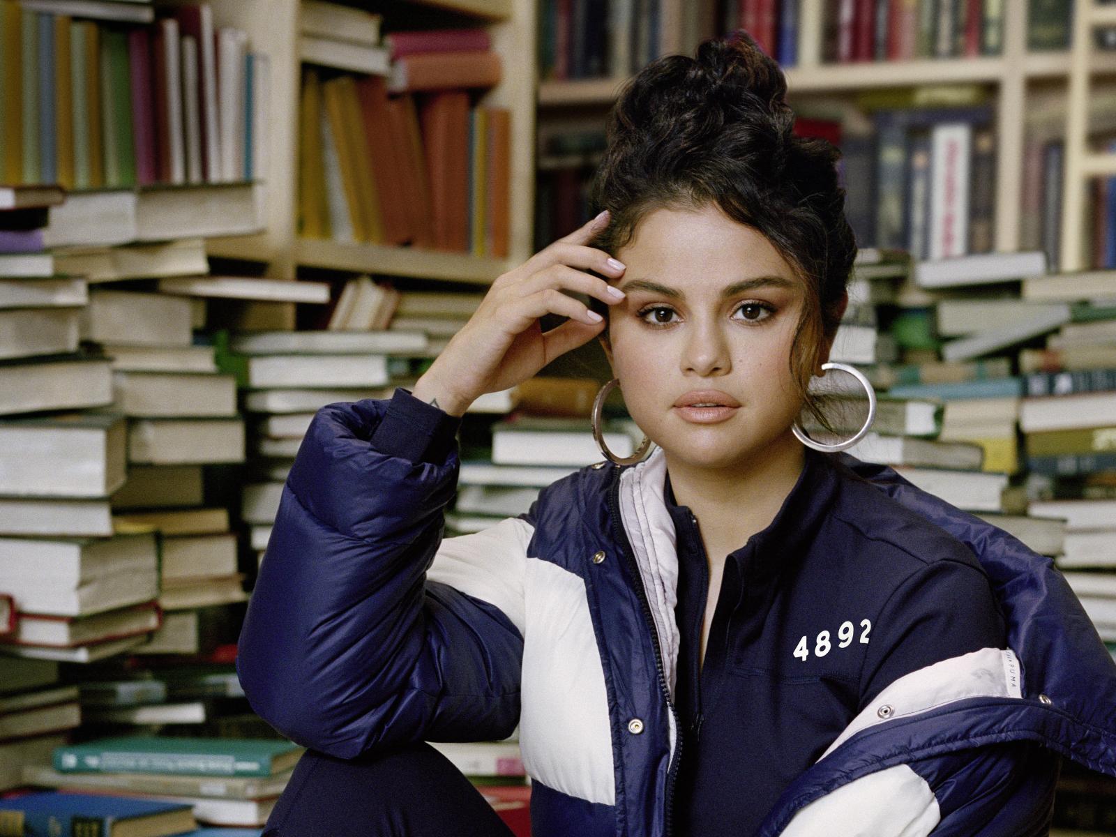 Обои Актриса и певица Селена Гомес в куртке сидит в библиотеке