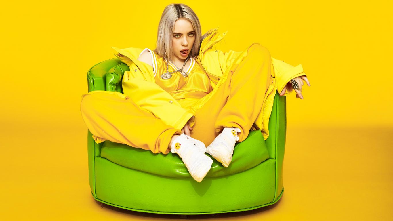 Обои Певица Билли Айлиш сидит в кресле на желтом фоне