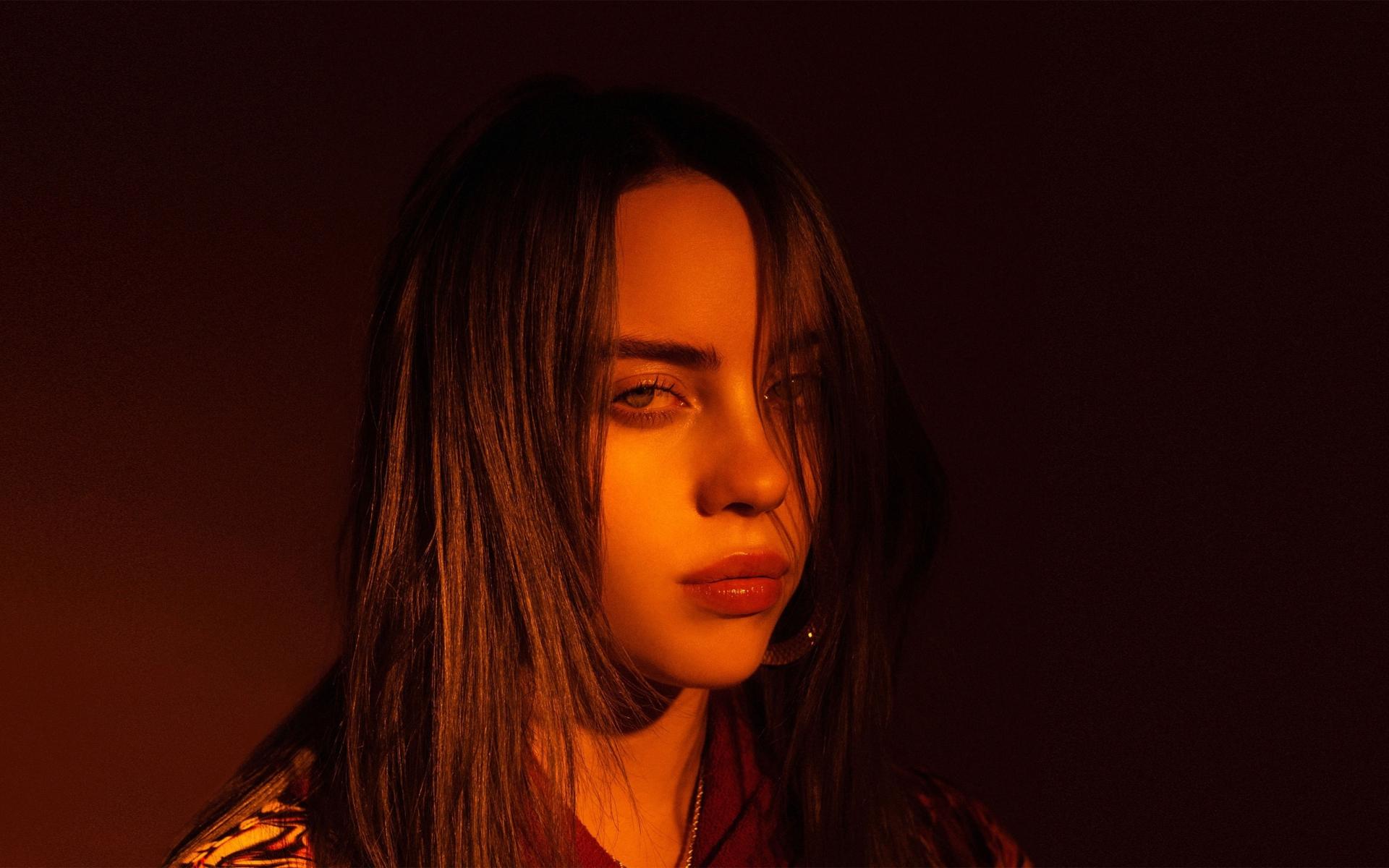 Обои Молодая певица Билли Айлиш на коричневом фоне