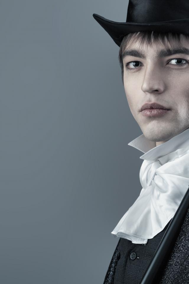 Обои Красивый молодой человек в черном цилиндре и фраке на сером фоне