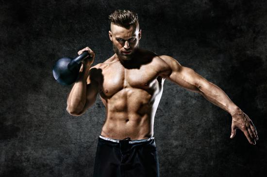 Обои Накаченный мужчина поднимает гирю на сером фоне
