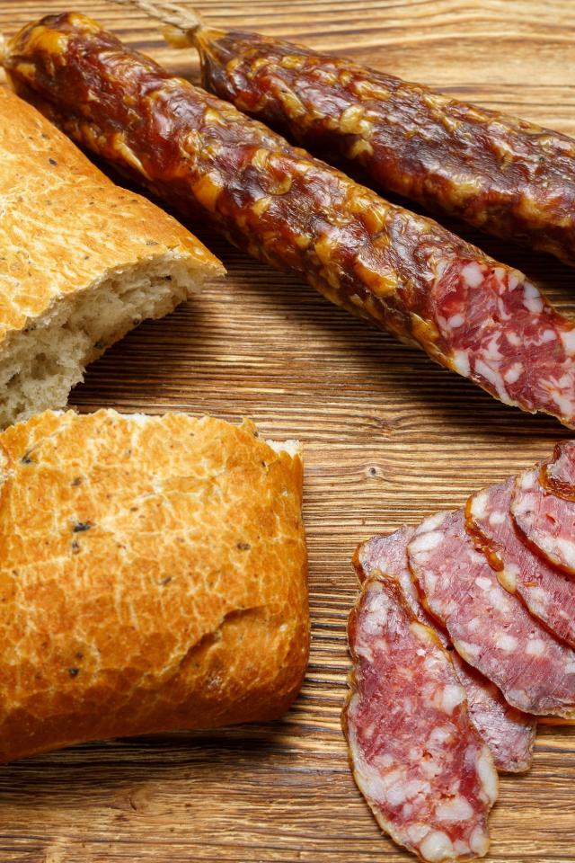 Обои Сухая колбаса на столе с батоном и оливками