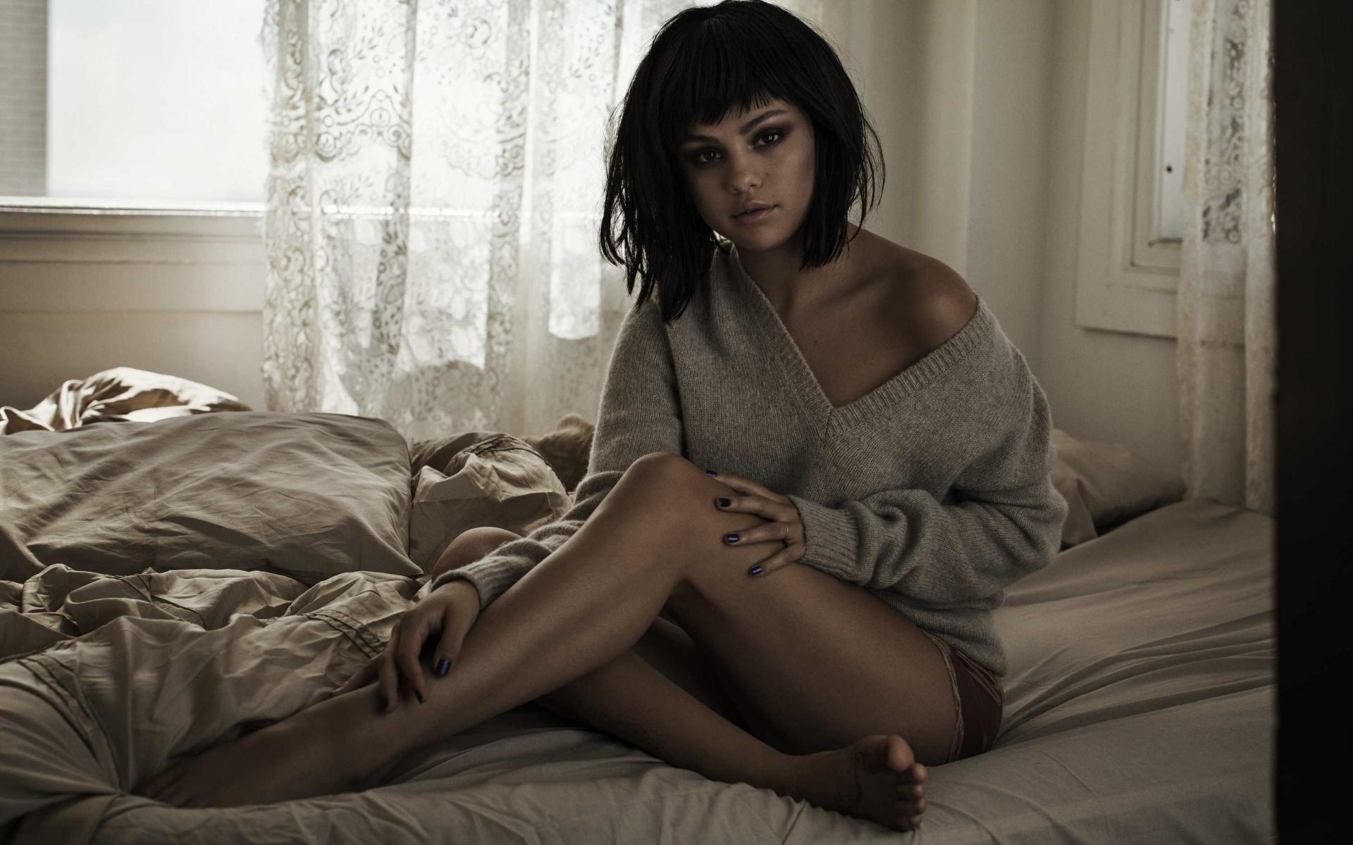 Обои Певица Селена Гомес сидит в свитере на кровати