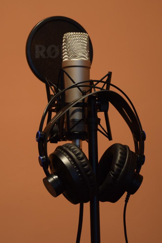 Обои Конденсаторный микрофон с наушниками на коричневом фоне