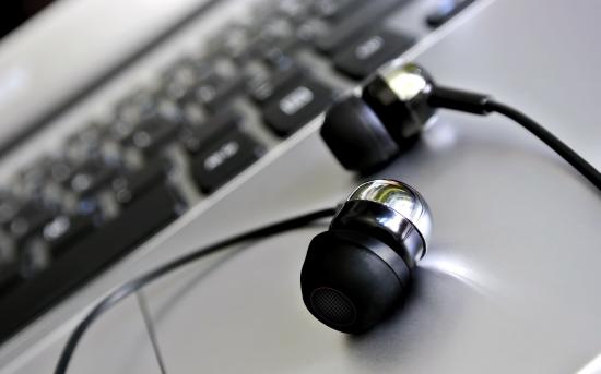 Обои Наушники лежат у клавиатуры крупным планом
