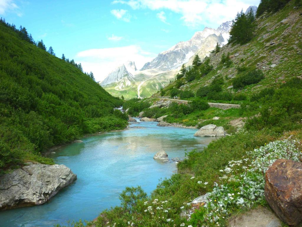 Обои Горная река меж зеленых берегов