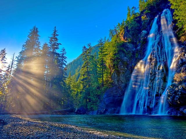 Обои Горный водопад в лучах солнца