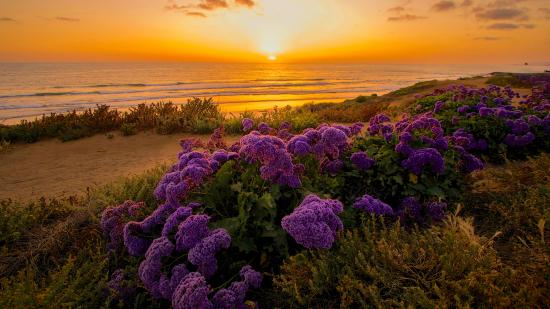Обои Сиреневые цветы на берегу океана на закате