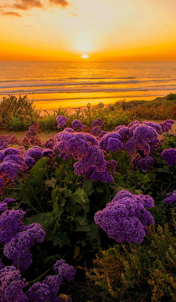 Обои Сиреневые цветы на берегу океана на закате