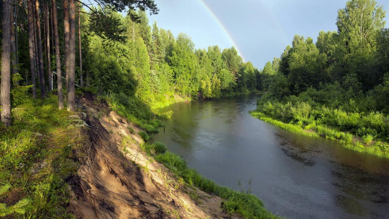 Обои Радуга над рекой в зеленом лесу