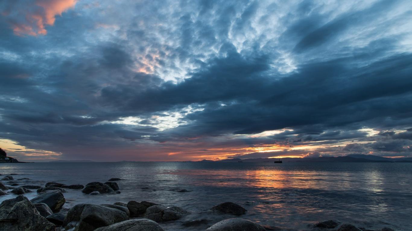 Обои Валуны в воде на берегу на фоне пасмурного неба