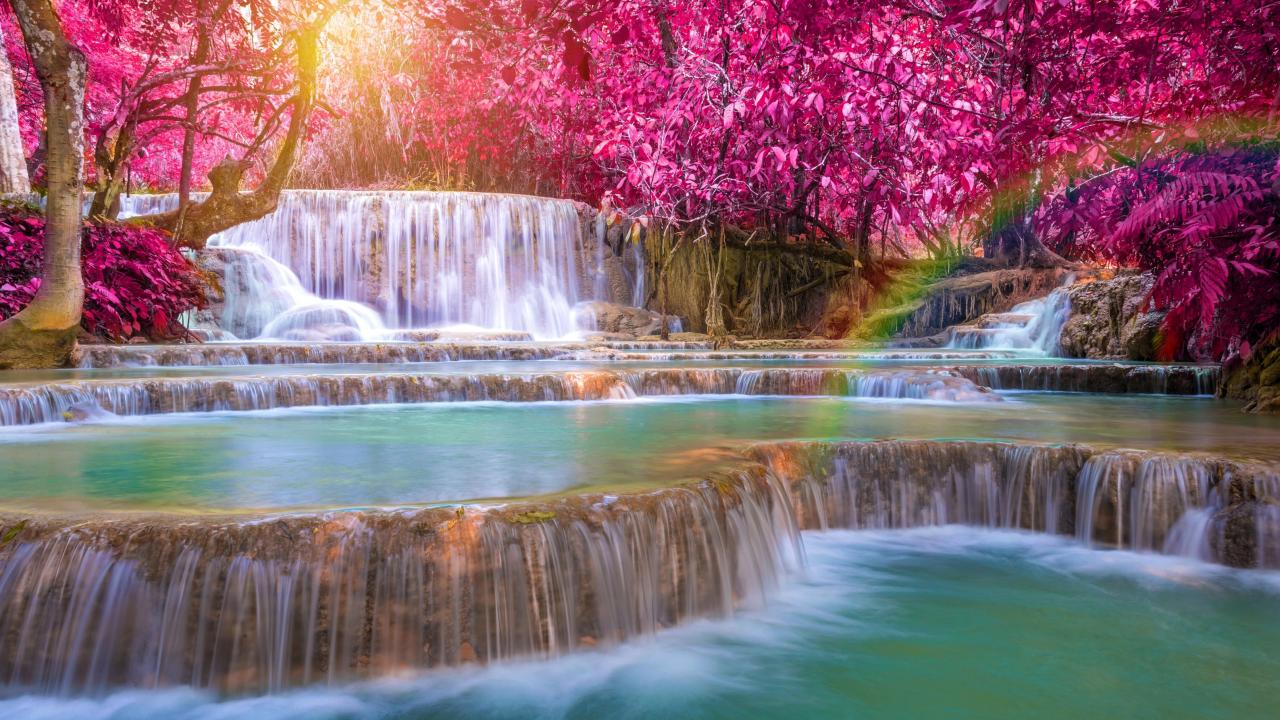 Обои Красивые деревья с красными листьями у водопада