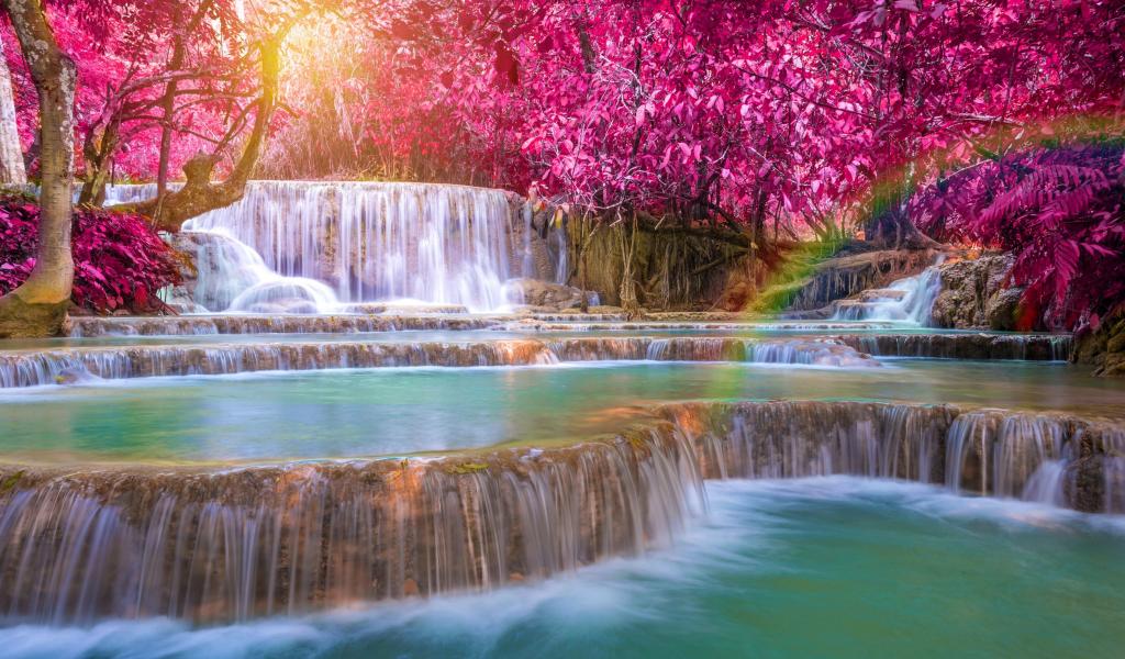 Обои Красивые деревья с красными листьями у водопада