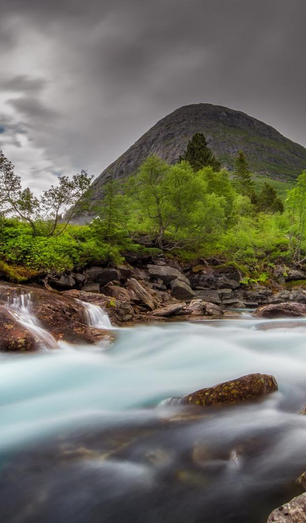Обои Быстрая вода в горной реке с маленьким водопадом
