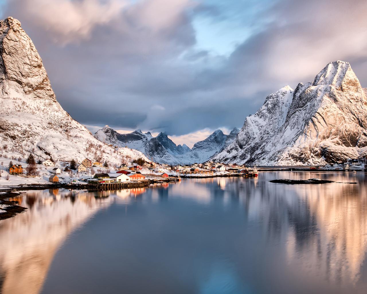 Обои Озеро у заснеженных гор, Лофотенские острова. Норвегия