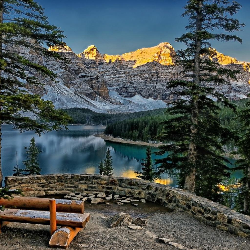 Обои Скамья с видом на горы и озеро Морейн в Канаде