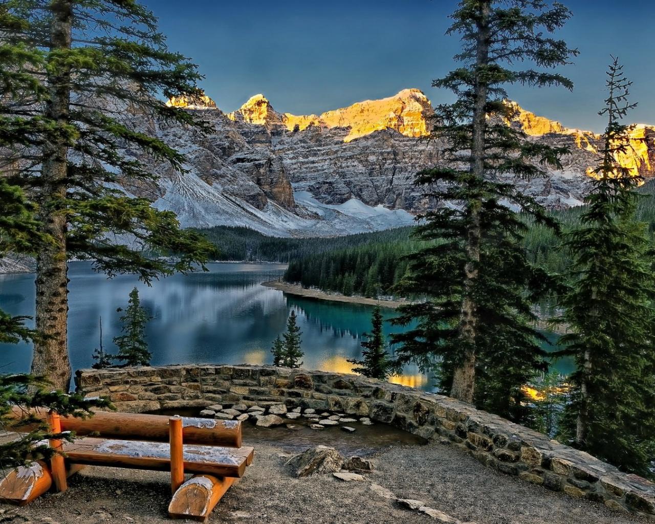Обои Скамья с видом на горы и озеро Морейн в Канаде