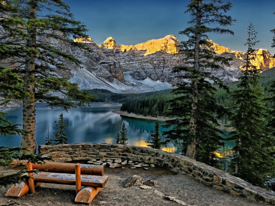 Обои Скамья с видом на горы и озеро Морейн в Канаде