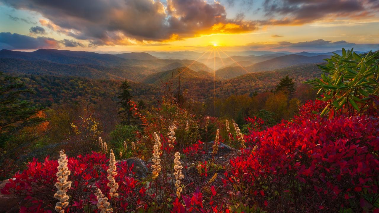 Обои Закат солнца в небе над горным пейзажем