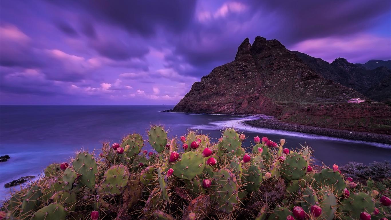 Обои Кактусы на побережье на фоне красивого фиолетового неба