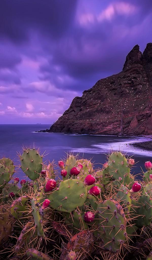 Обои Кактусы на побережье на фоне красивого фиолетового неба