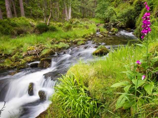 Обои Сиреневый цветок растет на берегу у лесного ручья