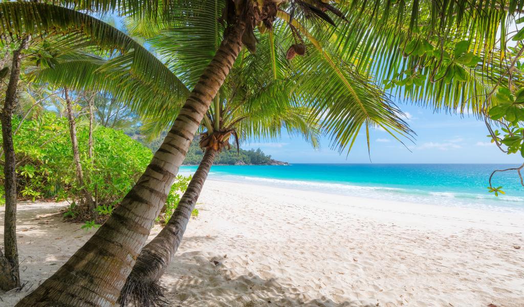 Обои Зеленые пальмы на белом песке на берегу океана в тропиках