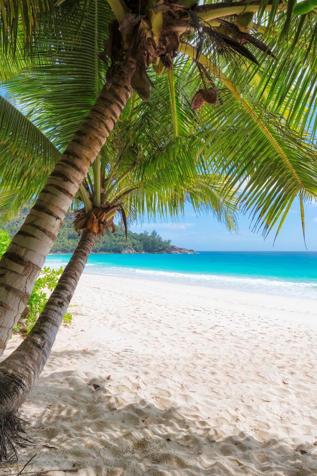 Обои Зеленые пальмы на белом песке на берегу океана в тропиках
