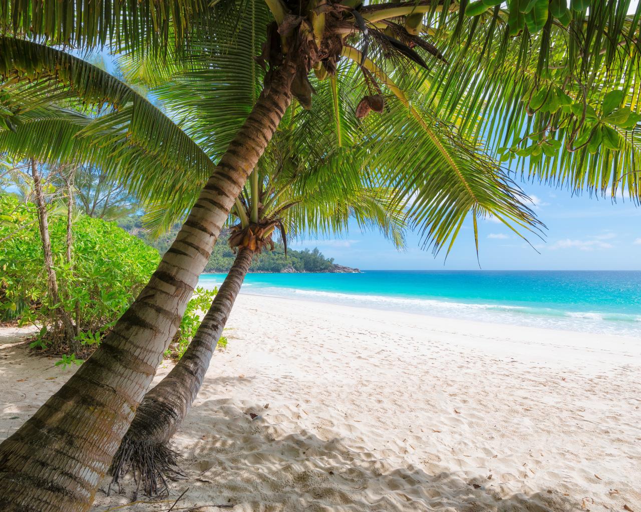 Обои Зеленые пальмы на белом песке на берегу океана в тропиках