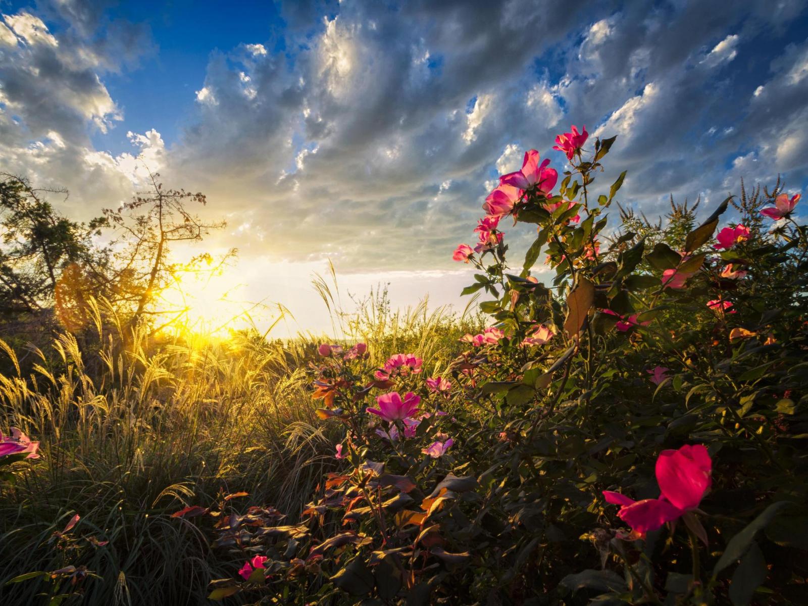 Обои Теплые солнечные лучи падают на цветы на рассвете