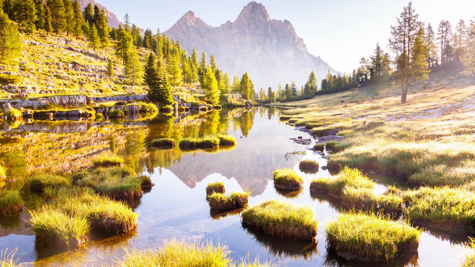 Обои Горы трава и деревья отражаются в лесном озере