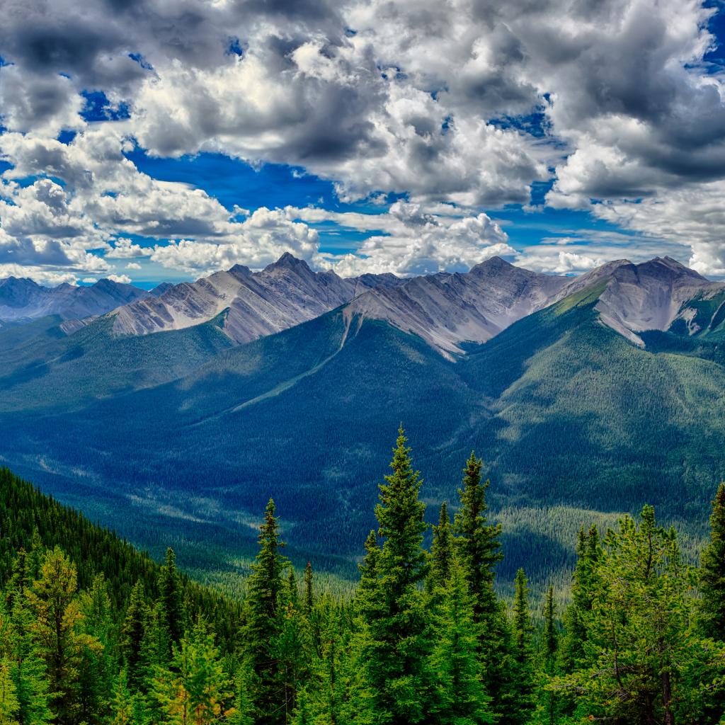 Обои Красивое небо с белыми облаками над покрытыми лесом горами