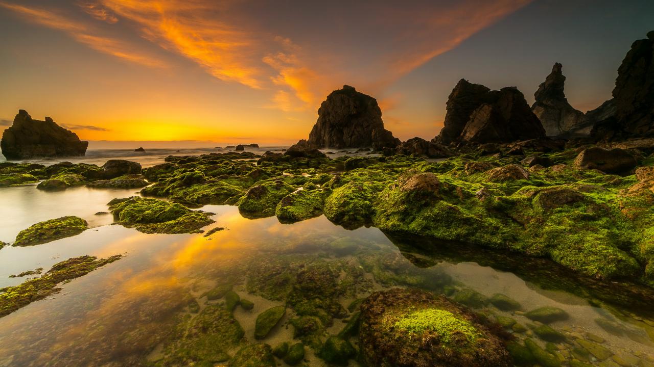 Обои Покрытые мхом камни на морском берегу под красивым небом