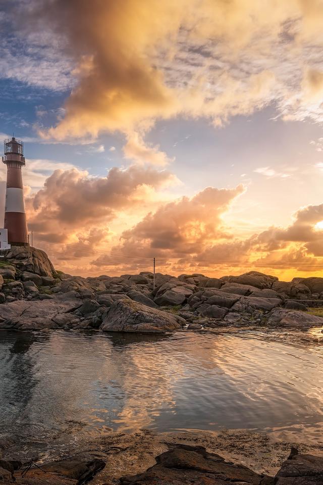 Обои Маяк на каменном побережье на фоне красивого неба