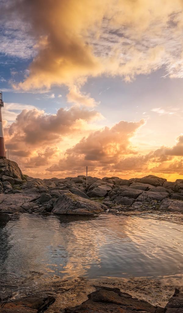 Обои Маяк на каменном побережье на фоне красивого неба