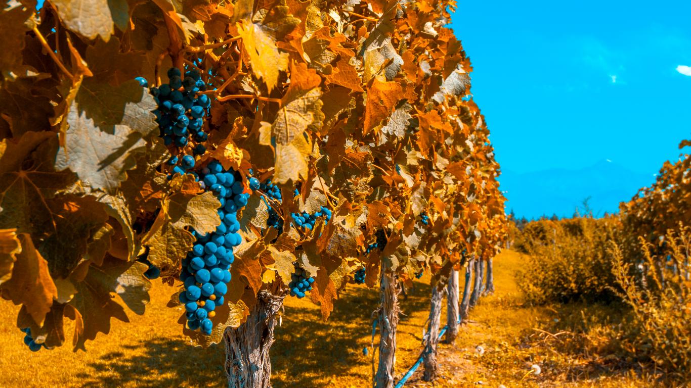 Обои Виноградники со спелым синим виноградом под голубым небом осенью
