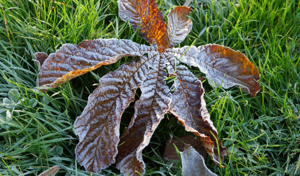Обои Сухой лист покрытый инеем лежит на зеленой траве