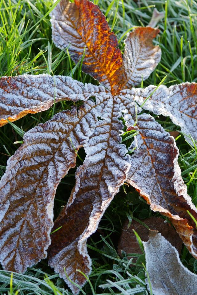 Обои Сухой лист покрытый инеем лежит на зеленой траве
