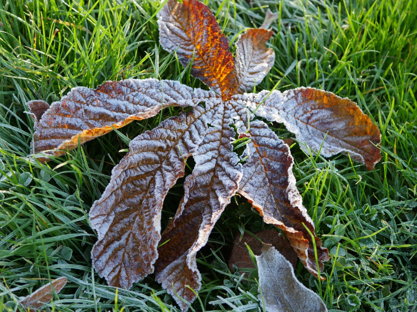 Обои Сухой лист покрытый инеем лежит на зеленой траве